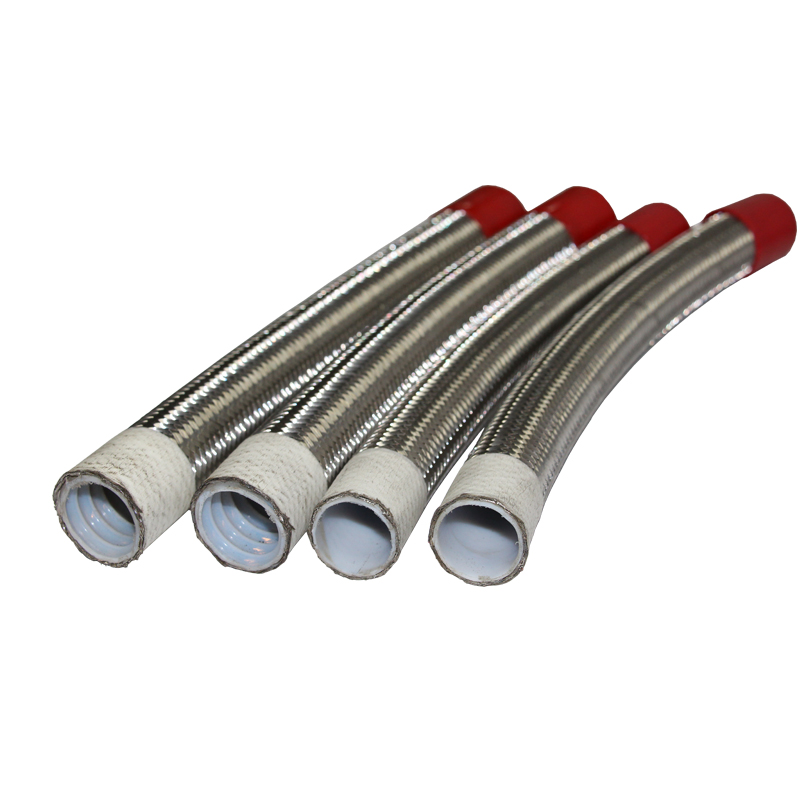 High-temperature PTFE (polytetrafluoroethylene) hydraulic hoses offer excellent heat and corrosion resistance, with a temperature range of -70°C to +260°C. The PTFE inner tube offers low friction, resists aging, and facilitates fluid transfer. The outer layer is reinforced with braided stainless steel wire and can operate in high-pressure environments.